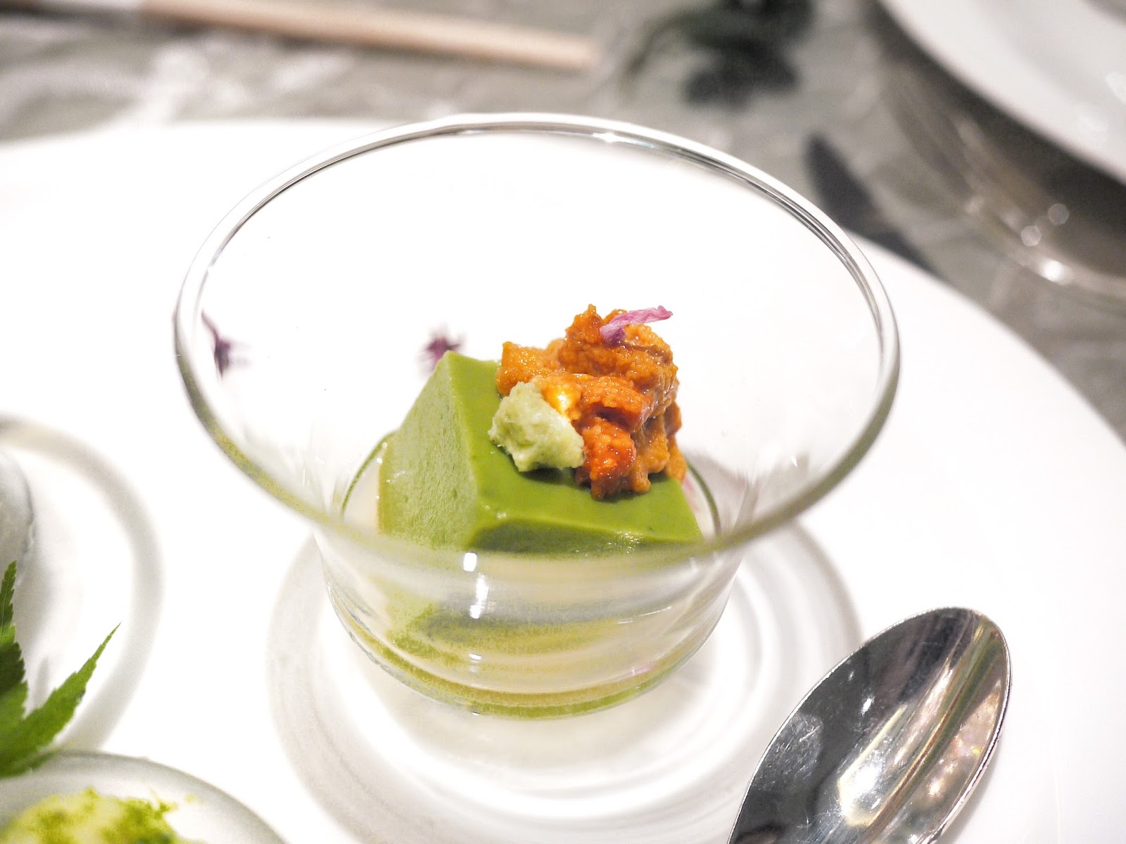Matcha Green Tea Soy Tofu with Sea Urchin & Grated Wasabi - 抹茶豆腐伴海贍